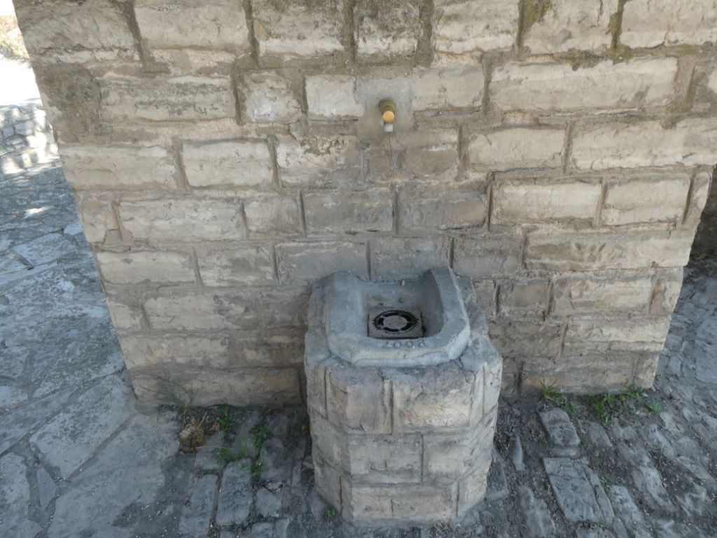 Senzilla Font amb una aixeta polsador que l’aigua sobrant va a una pica quadrada.