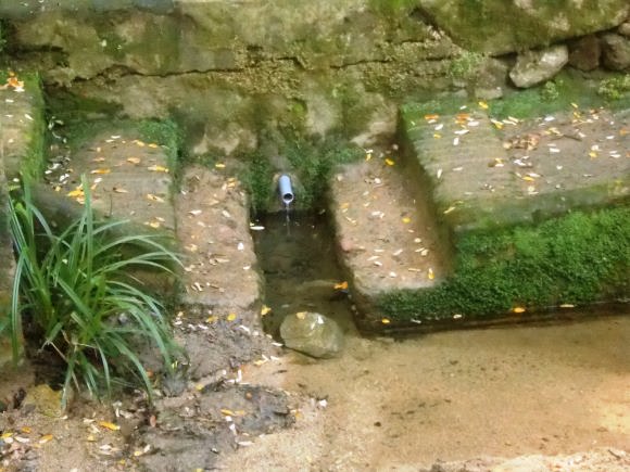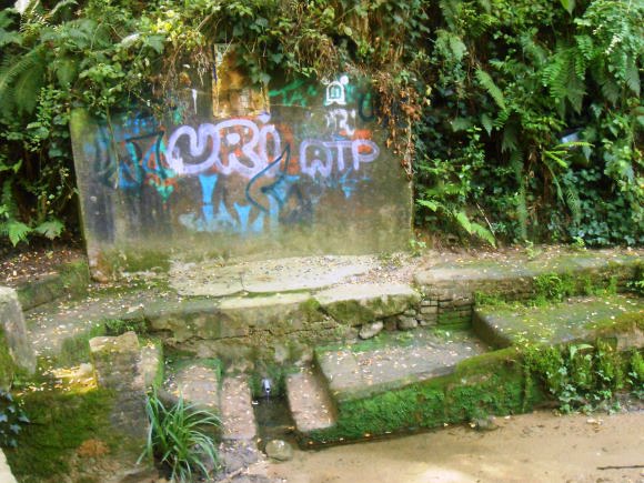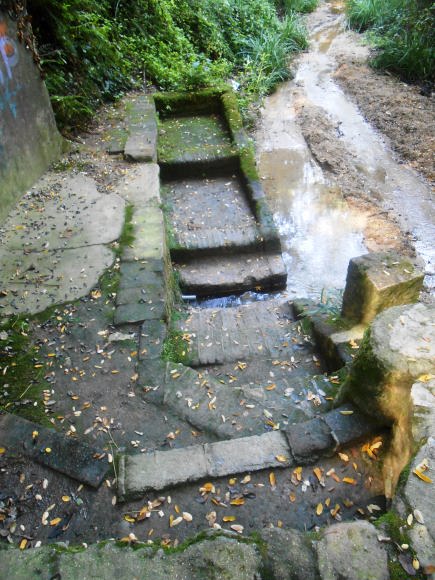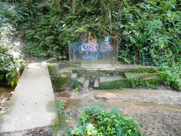 Un cop a l’altre costat de la riera, baixarem per uns esglaons, que ens facilitaran l’accés al broc de la font. Es una estructura solida feta d’obra amb unes rajoles en la part central superior, avui totalment trencades.