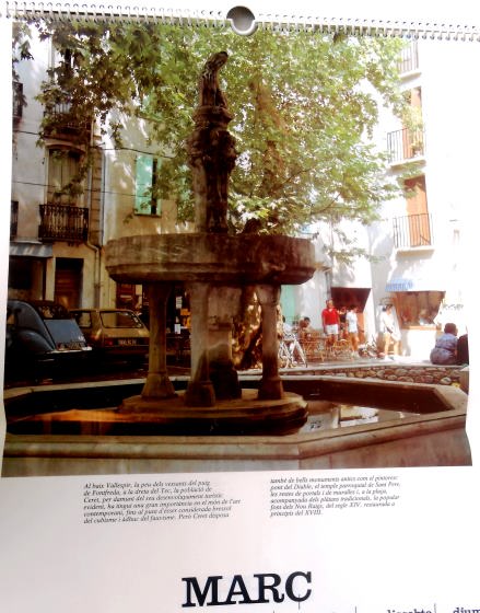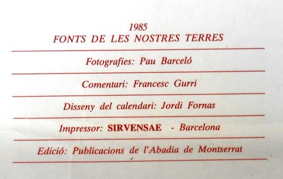 Serra d’Or, va volgué editar un Calendari a l’any 1985, sobre unes fonts destacades de Catalunya, País Valencia, Balears.DSCN3798_01Cada mes corresponia a una Font, amb un petit comentari explicatiu a peu de la fotografia a tot color, d’on era i altres dades segons la Font.DSCN3797_01Es passo les 12 fotografies i el nom de la Font amb el lloc de ubicació :