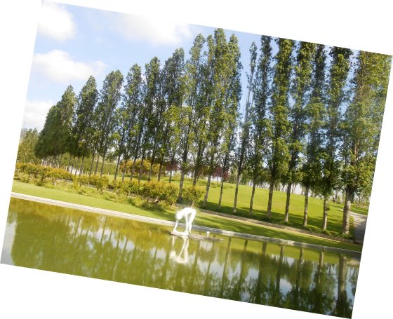 I al mig una zona amb gespa, un estany i un petit bosquet. Amb un total de tres hectàrees de terreny.