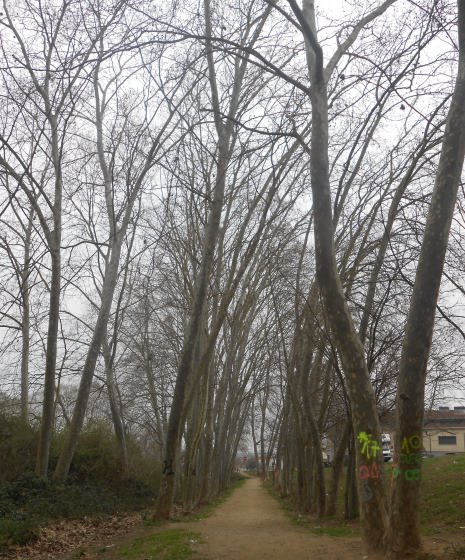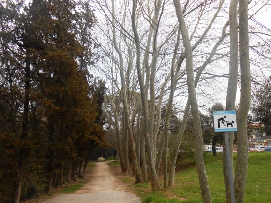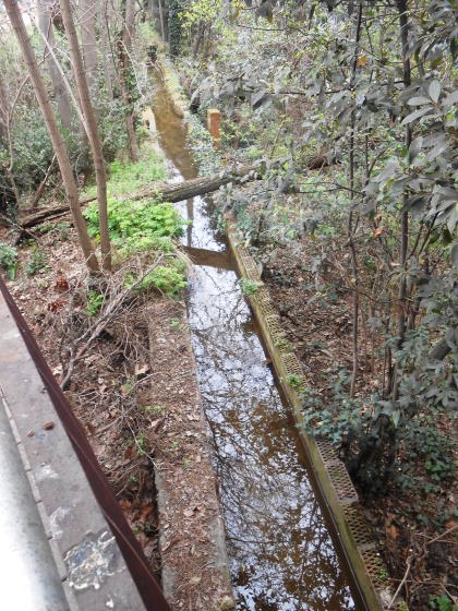 Allí mateix hi ha uns plàtans i pins destacables per la seva altura, i podeu veure una sèquia al seu costat dret.