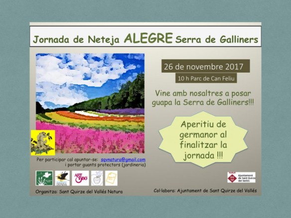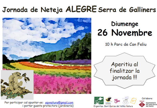 “La Jornada de neteja ALEGRE Serra de Galliners”, està organitzada per Sant Quirze Natura amb la col·laboració de l’Ajuntament de Sant Quirze del Vallès, ArtBo, Grup Catalana Occident, Fruites Laura, Fruiteria el Mas, Llibreria Dina 4, Diari Sant Quirze, DEPANA: Grup GAP (Grup d’Acció Forestal), 1 diumenge al mes fan gestió forestal amb voluntariat de control de plantes exòtiques en el Parc de Collserola) i l’Associació Corrandes Animació.