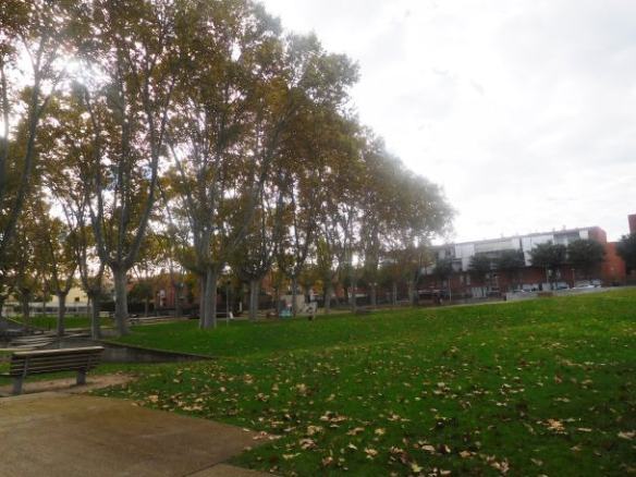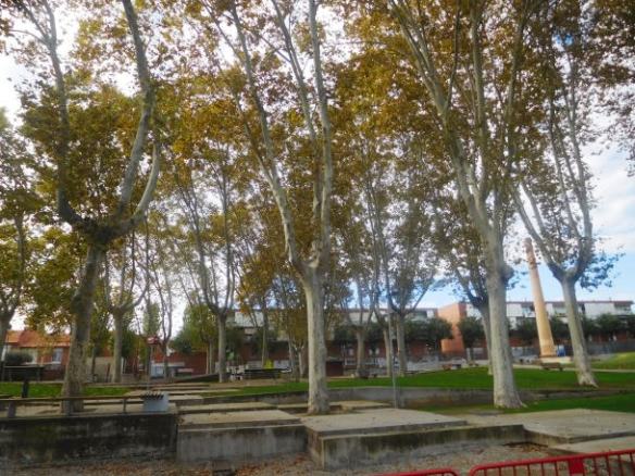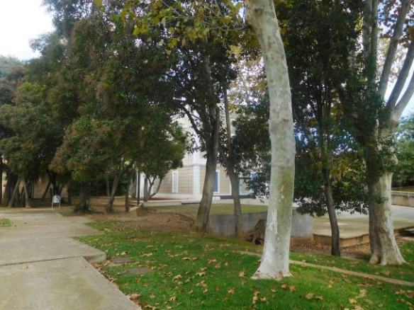 Grans plataners i altres arbres i planters de gespa ben cuidada.