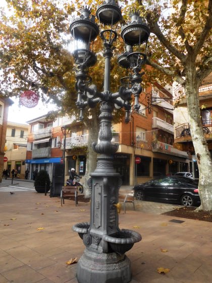 - Aquesta Font es la base d’una farola que esta formada per 5 braços i per 5 punts de llum. I decorada per varis motius i l’escut de la Vila.