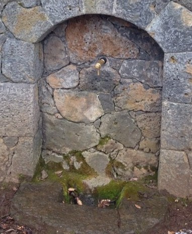 Font feta d’obra de grans rocs, i situada a dins d’una arcada, hi ha l’aixeta de polsador, l’aigua sobrant cau a una no massa gran pica.