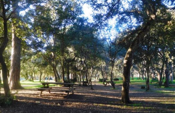Una gran zona de Pin nic, amb taules i bancs de fusta, rodejat d’arbres amb molta alçada i corpulents. (No es pot fer foc)