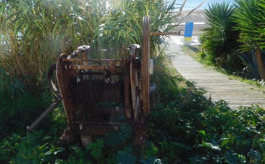 Aquests primers passos trobareu, en la platja per on aneu passant una resta del passat pesquer, com l’aparell per arrastrar les barques i alguna vella barca,