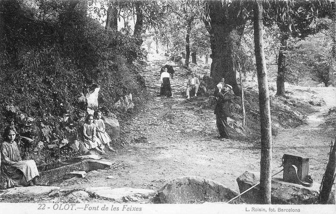 “ Aquesta antiga Font de les Feixes, esta a prop de la masia Les Feixes d’Olot,una mica mes amunt de la Ribera de Ridaura.Per accedir, podeu anar per l’avinguda de Les Feixes, situada entre el Pla de Baix i el seu Polígon Industrial i front al Volcà de la Garrinada, un camí us portarà a peu de la font, que està tocant la paret en una zona bruta de vegetació…En l’actualitat, esta molt tapada per la vegetació, i es fa difícil de localitzar-la. En èpoques de grans pluges disposa de gran quantitat d’aigua, que surt per un gruixut tub, però, també pot en sequera baixar molt el seu cabal de sortida…”Avui la tornem a destacar, donat que es va procedir a netejar de vegetació la Font de les Feixes i altres indrets, per poder portar a terme La marxa de la Set, per les rodalies d’Olot tot visitant varies fonts del municipi, i va ser el dia 6 d’octubre de 2019.Per aquest motiu, ara si podem gaudir de la imatge verdadera de la Font i poc a canviat en mes de cents anys d’història que te aquesta Font de les Feixes, es pot veure la llarga pica i d’on surt l’aigua, quan raja…!Per cert, a poca distancia trobareu a peu del camí, la cova de les Feixes.