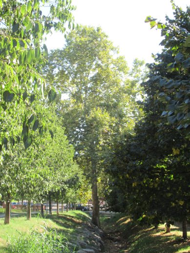 Ara, ens fitxem en la part de sobre mateix del carrer de Collsabadell trobem una renglera de Plataners, tots molt junts uns amb els altres i situats en el vell mig del Torrent de Vallbona i paral·lels al carrer de Pedraforca,