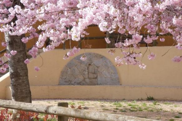 Esta en un mur fet de pedres tot donant una forma de semi circumferència.