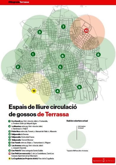Us passo un cartell d’ubicació de les 11 zones de lliure circulació de gossos a Terrassa.