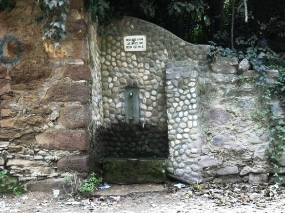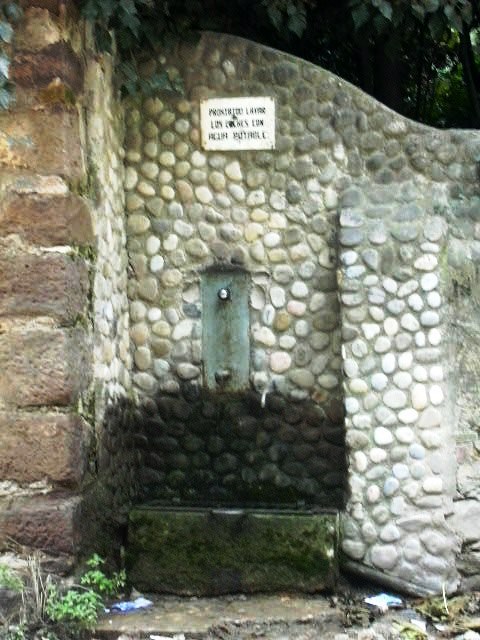 La paret esta plena de pedres rodones de riera, l’aigua surt d’un tub que cau a una pica de pedra rectangular, actualment podria ser que no surtis aigua…