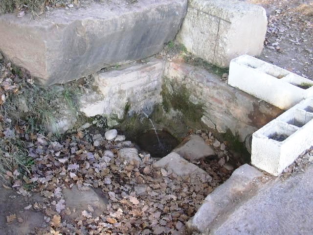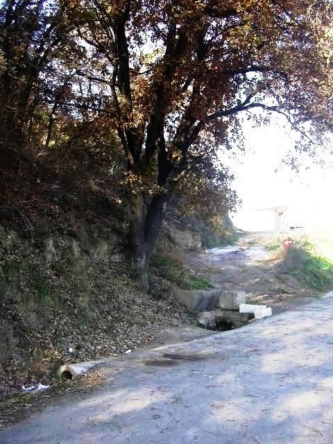 el broc surt de la paret i desguassa per una canaló que passa per sota de la carretera, un bonic roure li fa ombra,