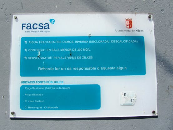 Un exemple el tenim a Xilxes, municipi de la província de Castelló, situat en la Comarca de la Plana Baixa. Compta amb aproximadament 2752 habitants (INE 2015). FACSA gestiona la xarxa municipal de aigua potable i clavegueram municipal des de 2009. Des del Consorci de la Plana i dues captacions, s’abasteix a les fonts públiques, a la zona del nucli urbà i a la zona de la platja de Xilxes. S’emmagatzema i tracta l’aigua en un dipòsit del municipi i, a més, per a subministrar l’aigua a les fonts públiques, es fa passar per una estació de tractament d’aigua per osmosi inversa.