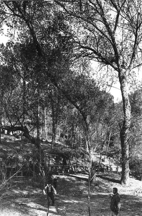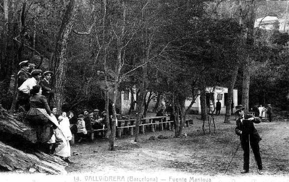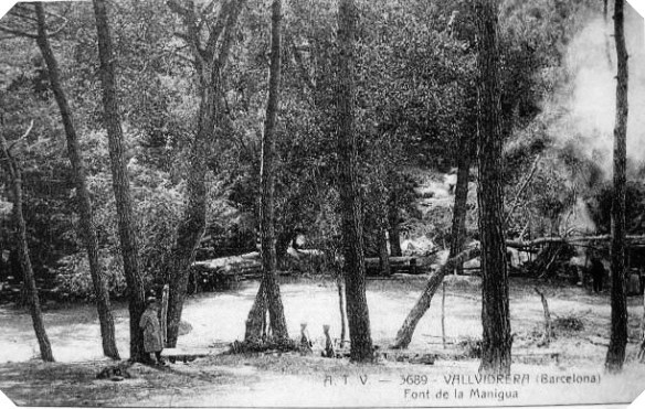 “…Font de La Manigua – A unos ocho minutos del apeadero, siguiendo aguas abajo el curso de la riera, se halla esta Fuente, una de las más antiguas del valle. Son en gran número las familias amantes del bullicio campestre que acuden a este merendero, donde al son de los altavoces se come y se baila”…