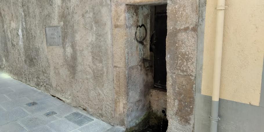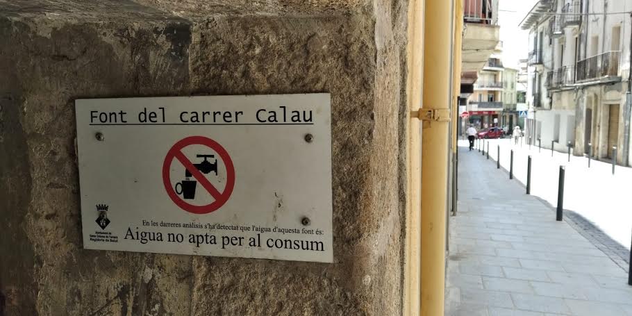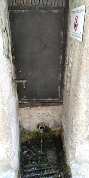 L’aigua raja per un broc de ferro situat a la part baixa i també per una aixeta de polsador en el lateral esquerre, la sobrant va a una pica.