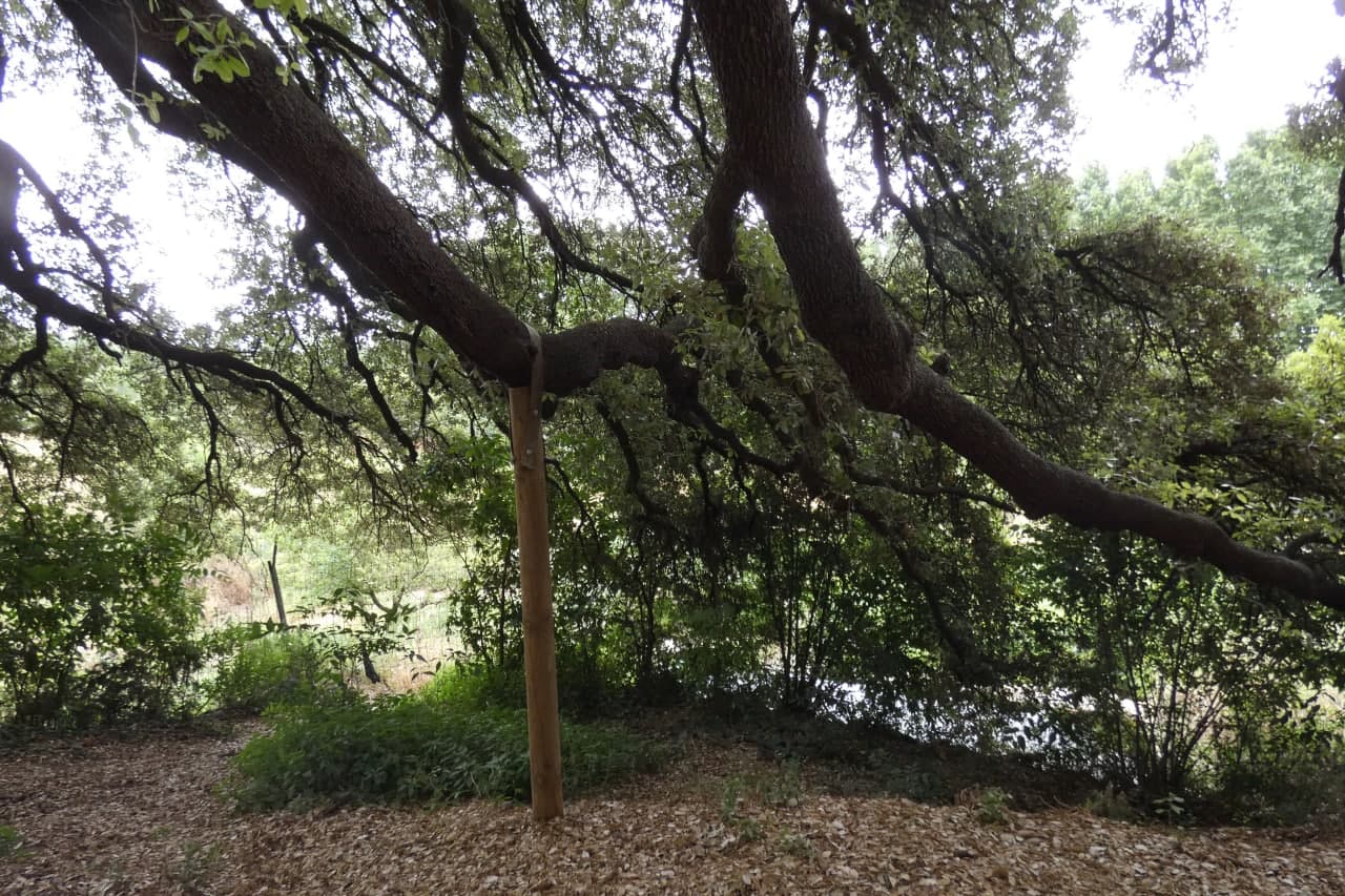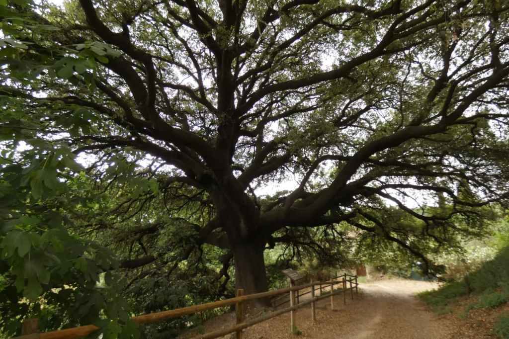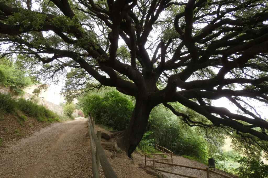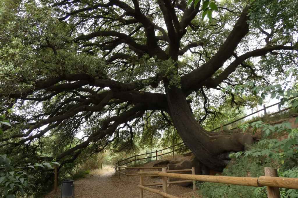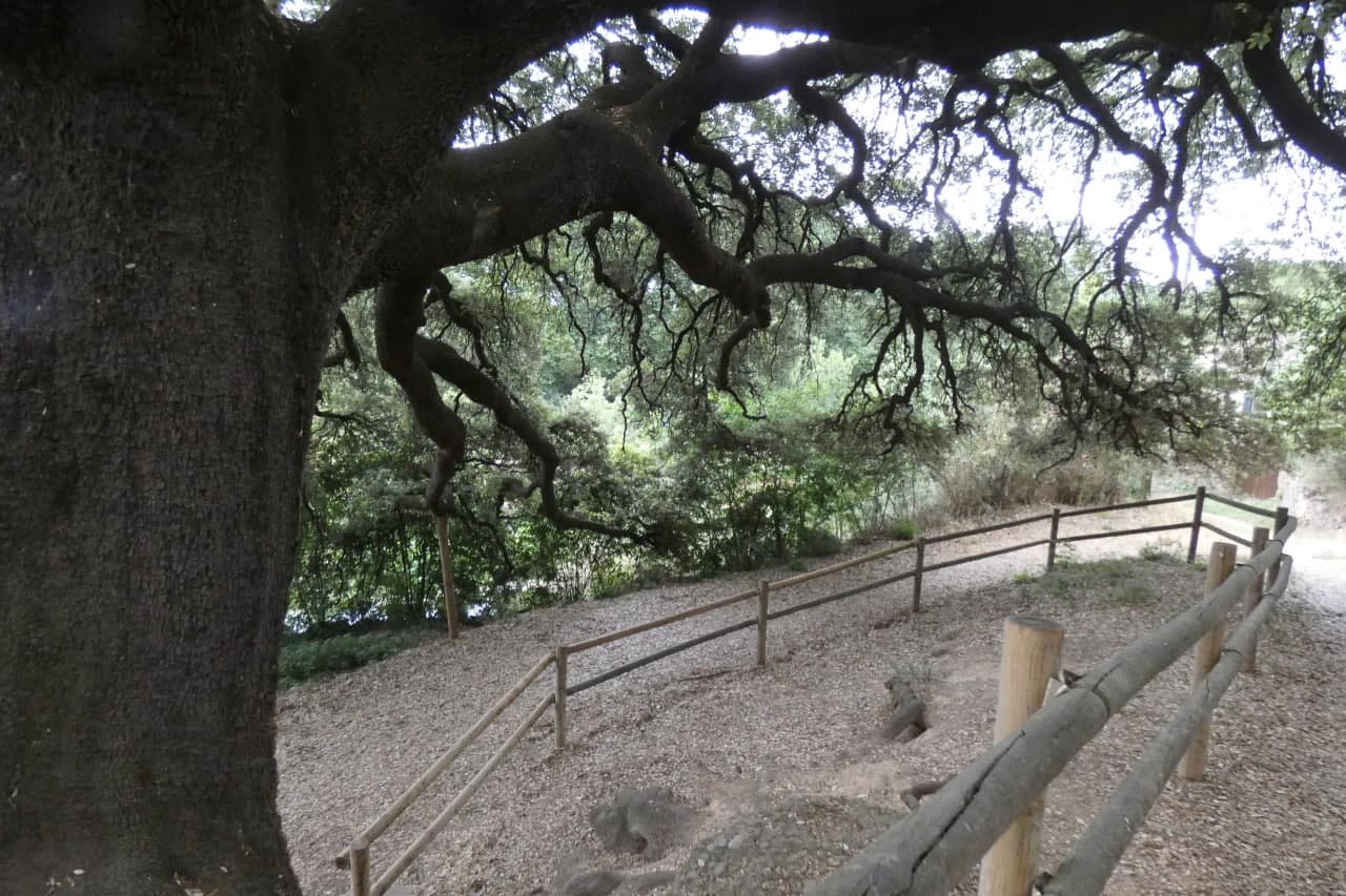 El tronc està lleugerament inclinat i es fixa al marge del camí amb unes arrels de grans dimensions que queden parcialment al descobert.