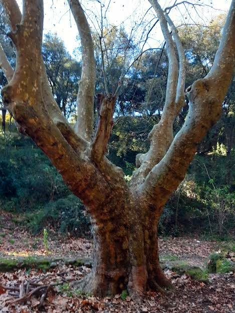 Veureu un vell plataner de dimensions molt destacables que dona ombra a l’espai de la font.