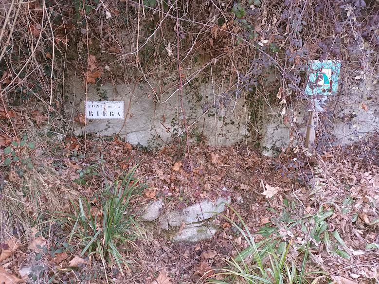 En cada costat de la Font disposeu de dos bancs de pedra per seure. Al fons circula la riera de les Gorgues.