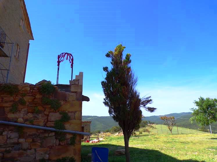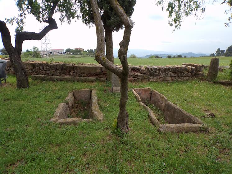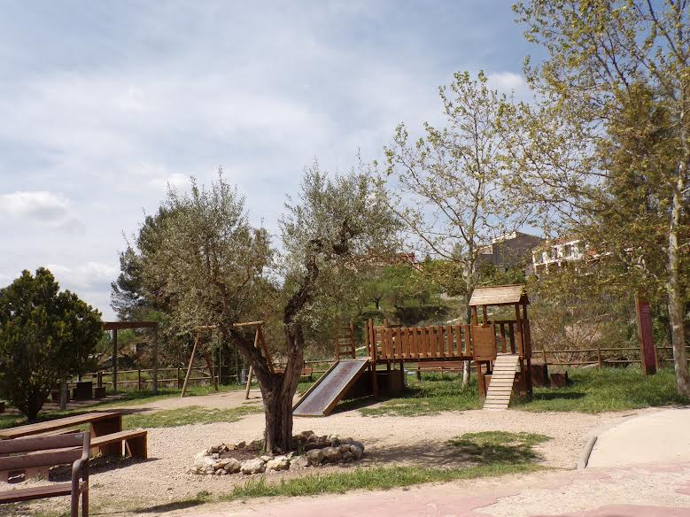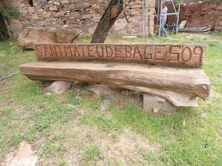 Front seu i sota l’ombra de dos xiprers hi han dos taules i seients de pedra que figuren uns bolets.