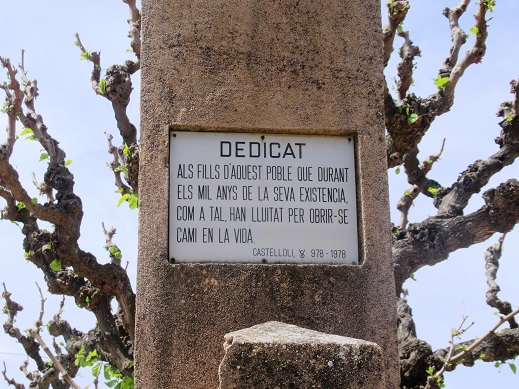 És una font commemorativa, dedicada a tota la gent del poble que els mil anys de la seva existència, com a tal han lluitat per obrir-se camí en la vida. Castellolí : 978 – 1978.