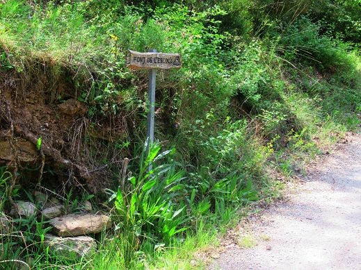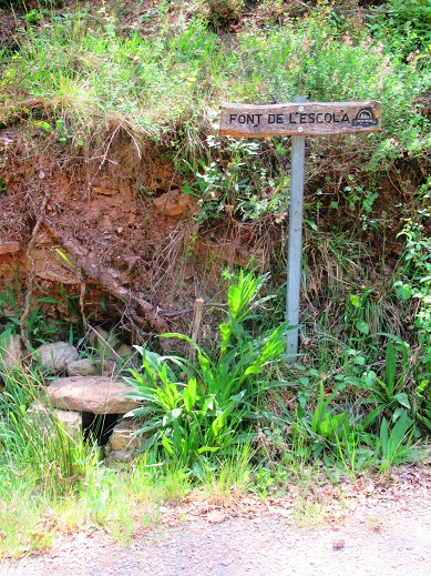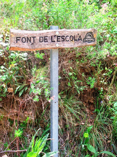 Poc havans d’arribar, al mateix camí a l’esquerra, trobarem un cartell que ens indica la situació de La Font de l’Escolà.
