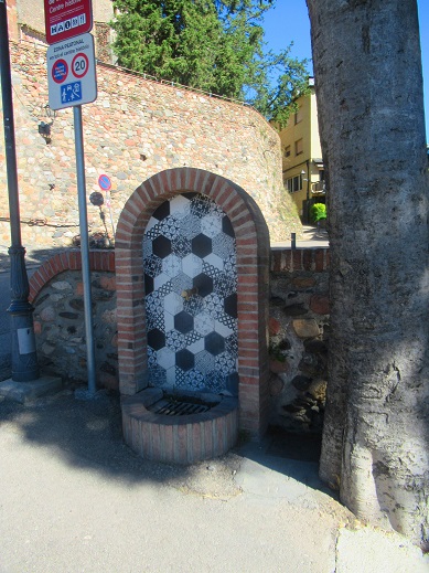 L’estructura esta adossada a un mur, disposa d’una aixeta polsador al centre d’una paret de rajoles de diferents formes;