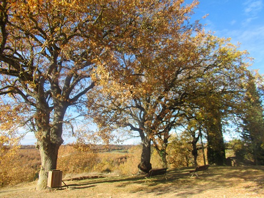 Són uns vells i bells exemplars de roures, estan com a sentinelles guardant aquest lloc religiós, disposen de 2 bancs per admirar el paisatge des d’aquest punt.