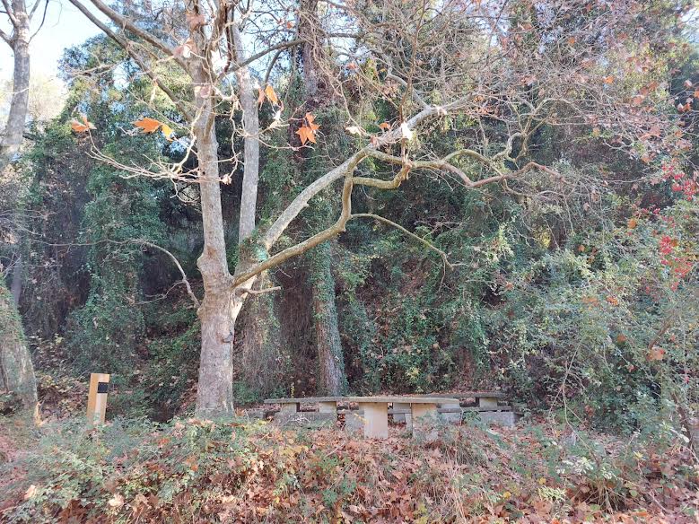 A mà dreta hi ha uns plataners amb bancs i seients de pedra i la font, arran de terra.