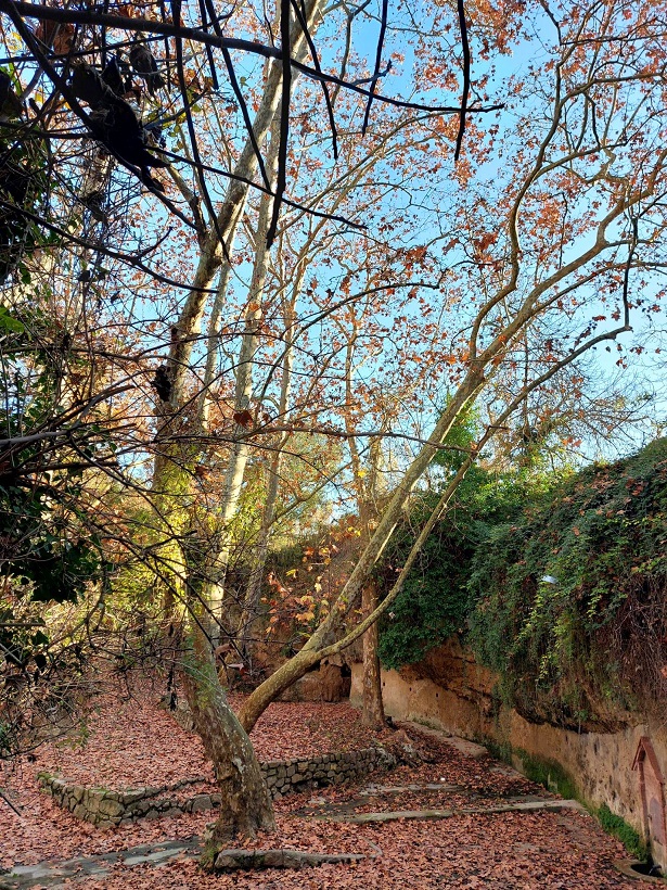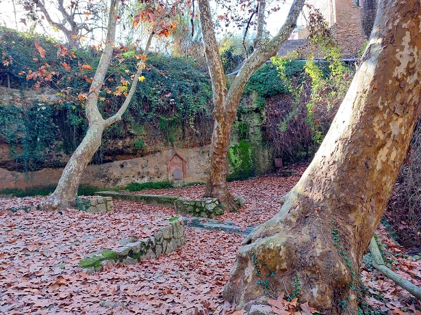 L’espai està cobert per plataners de mida gran i algunes espècies de ribera que segueixen la riera.