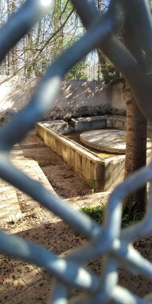 Safareig de planta rectangular envoltat completament d’una tanca, amb superfície per rentar a tot volt i amb un sifó de desguàs al centre.