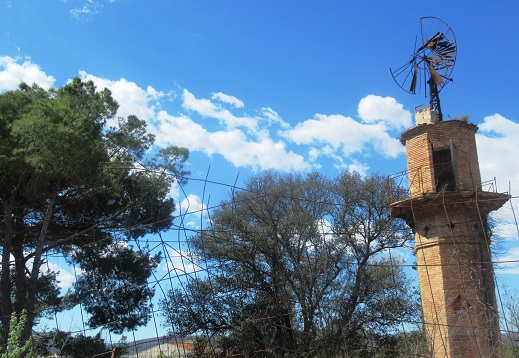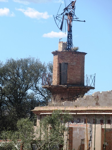 Al coronament, que està sustentat amb una volta de casquet esfèric, hi ha el mecanisme d’un molí de vent de ferro amb les aspes molt malmeses, trencades i rovellades.