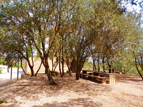 En una zona que s’ha habilitat amb taules i bancs, sota un petit alzinar jove.