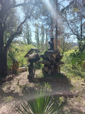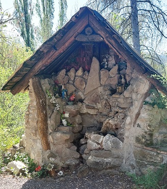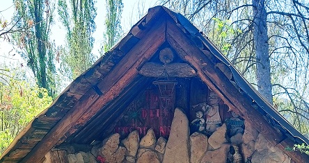 A la part alta hi trobem una caseta de pedra i fusta ornamentada amb un seguit de còdols que recreen la muntanya de Montserrat, amb una rèplica de la Moreneta i altres figuretes.