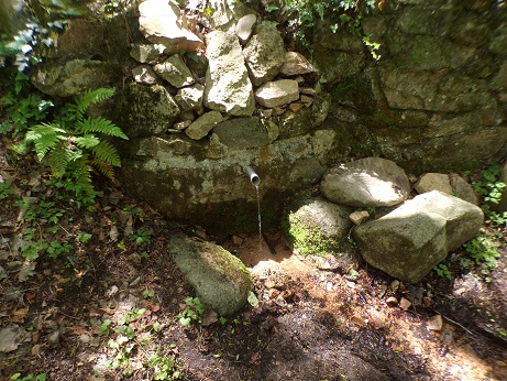 D’una paret d’obra surt un tub on la seva aigua cau a una senzilla pica.