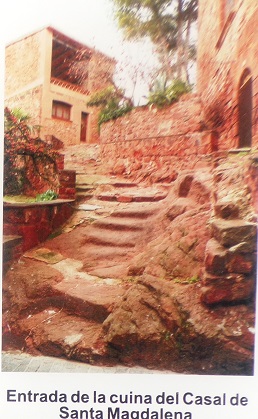 Al costat de les escales que pujant a la cuina del edifici del Casal, i a baix adossada a la paret, hi ha la Font.
