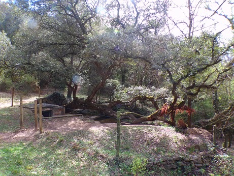Destaca l’alzina caiguda sobre la bassa casi rodona, l’arbre es manté viu.