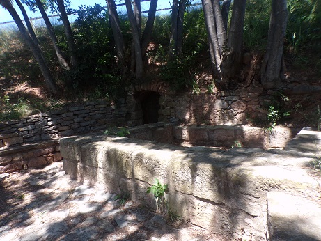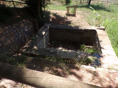Uns metres per sota del brollador de la font, a l’espai del costat en direcció al cingle, s’aprecien les restes d’una bassa quadrangular construïda en pedra.