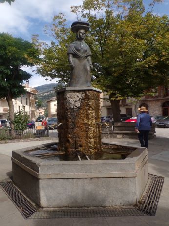 L’escultura esta a sobre d’una columna que de fet es una font de diversos brocs, l’aigua cau a una gran pica de sis cantonades.