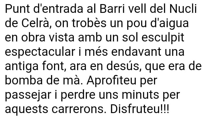 Pou de can Cornella del Torrent de Celrà Publicat el 14/02/2025 per Rasola Can Cornella del Torrent, esta situat en el carrer de la Maria Cristina de Celrà. Destaca pel seu pou, dintre de la finca, que es bombejava l’aigua per medi d’una bomba de ma. Text: Ramon Solé Fotografies: Dora Salvador Compartir: Feu clic per enviar un enllaç per correu electrònic a un amic (S'obre en una nova finestra) Correu electrònic Feu clic per imprimir (S'obre en una nova finestra) Imprimeix Feu clic per compartir al Facebook (S'obre en una nova finestra) Facebook Feu clic per compartir a X (S'obre en una nova finestra) X M'agrada S'està carregant... Relacionats