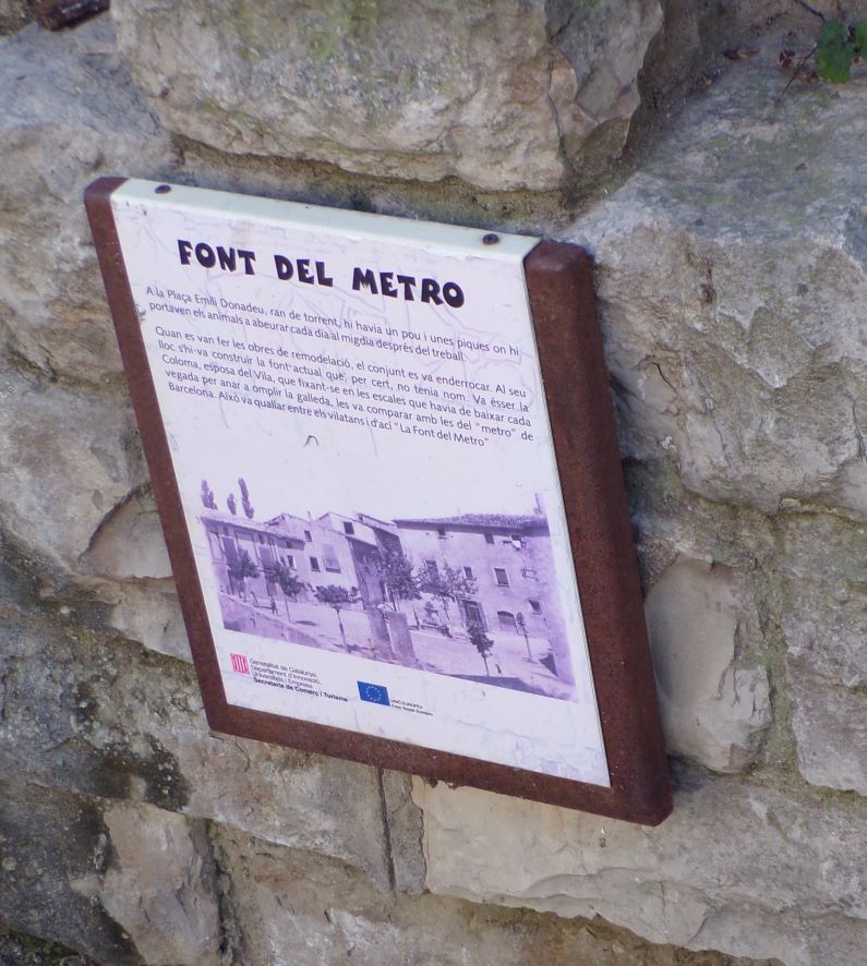 - Un cartell en la mateixa font, explica: “ ran de torrent, hi havia un pou i unes piques on hi portaven els animals a abeurar cada dia al migdia després del treball. Quan es van fer les obres de remodelació, el conjunt es va enderrocar.