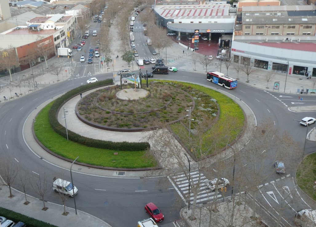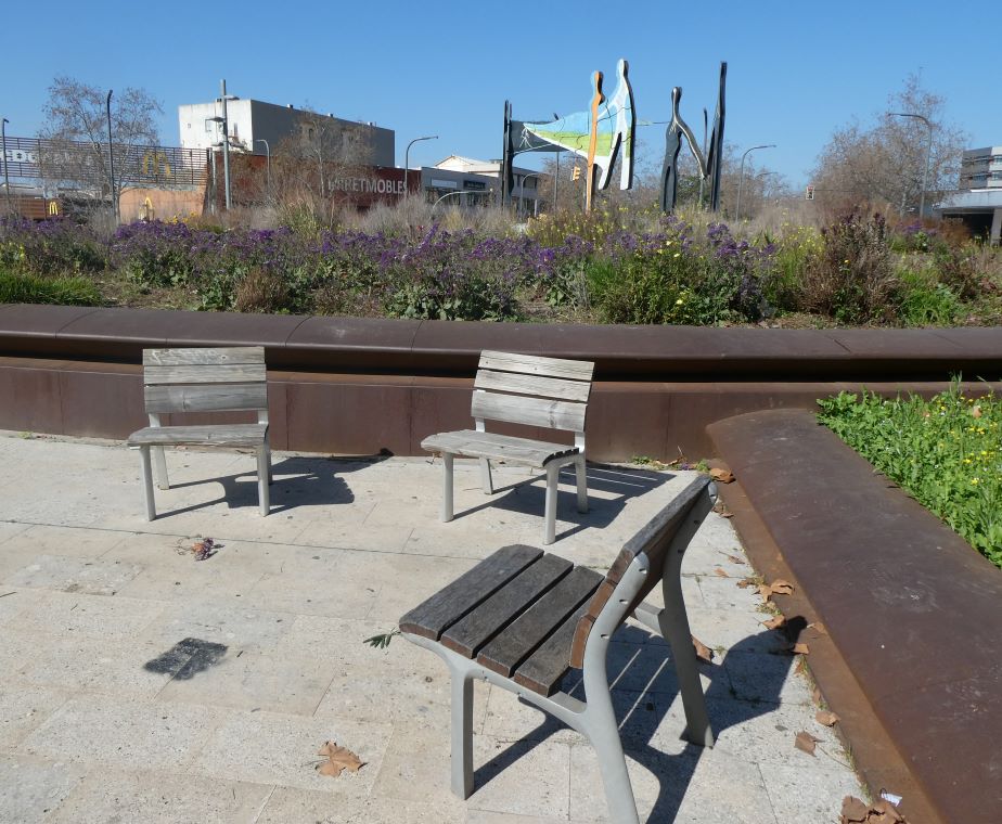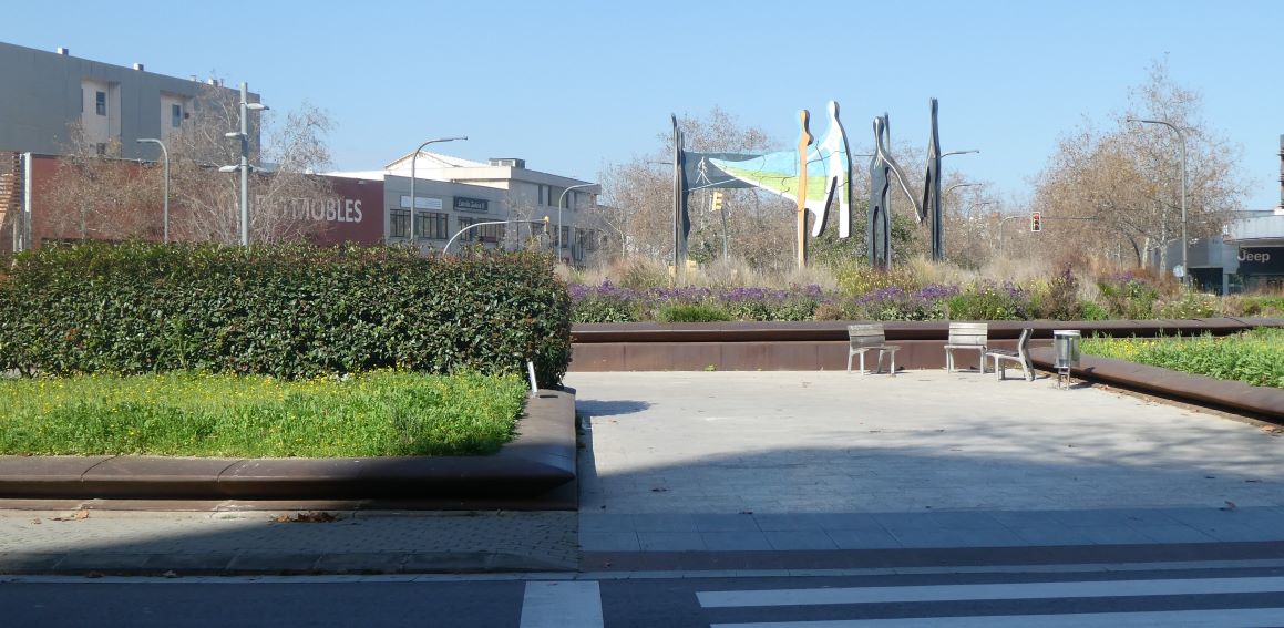 Al mig de la plaça n’hi ha una escultura coneguda al barri com “la sardana”, però que en realitat es diu La Bòbila.