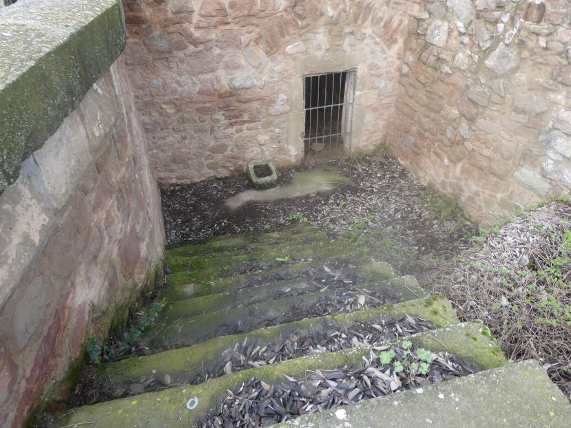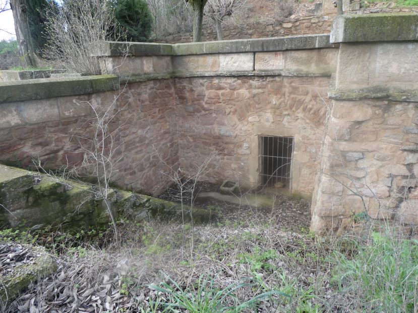 Un cop al replà inferior, hi ha una obertura (tancada amb una porta de ferro) que s’endinsa al talús de contenció fet amb pedra.