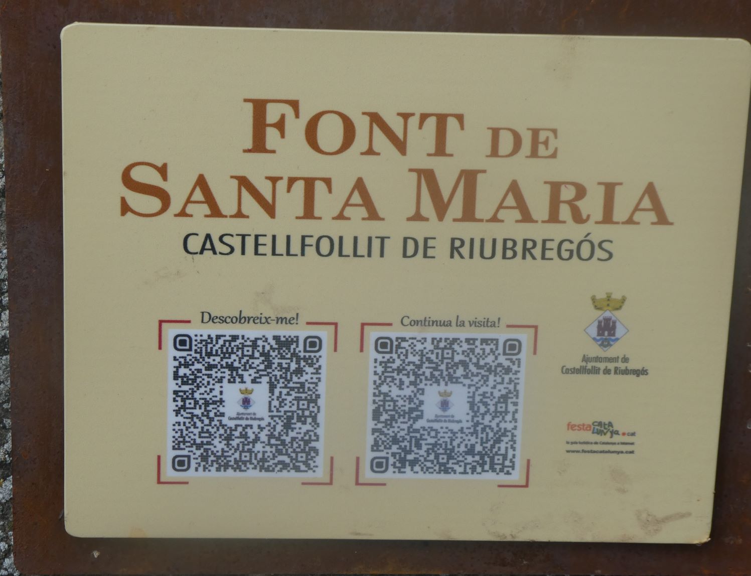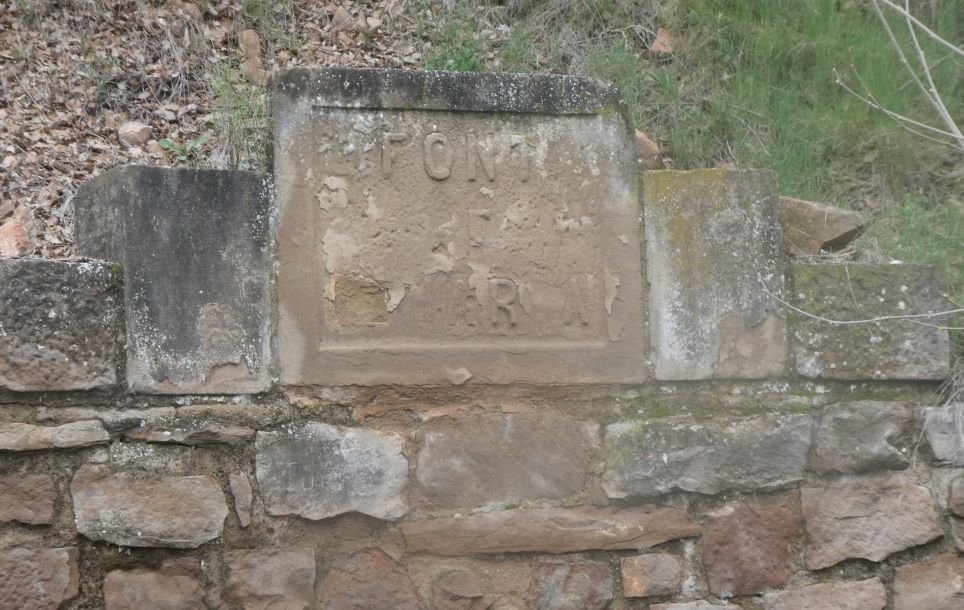 En la paret, hi ha un cartell amb el nom de la font, però molt deteriorat.