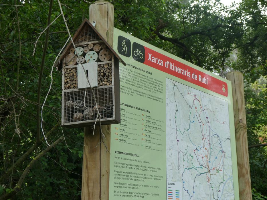 Veurem aquest petit Hotel d’insectes col·locat en un cartell de Itineraris de les rodalies de Rubí.