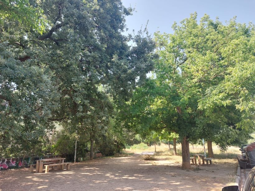 Hi ha un costat, on hi ha taules i bancs de fusta per poder fer un àpat.