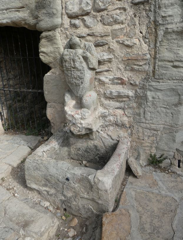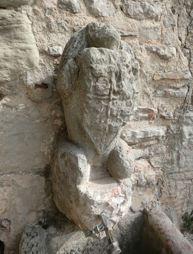 La capçalera de la font està representada amb una escultura zoomorfa, en posició asseguda damunt d’un seient de pedra, amb respatller, a la qual li manca el cap.