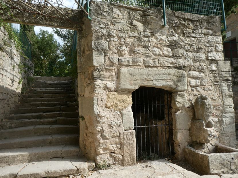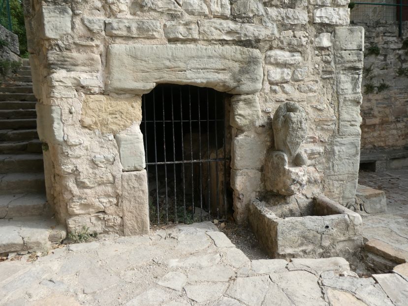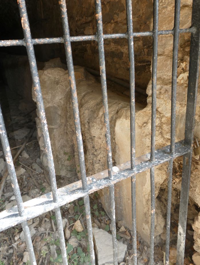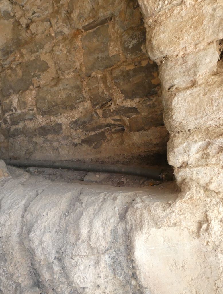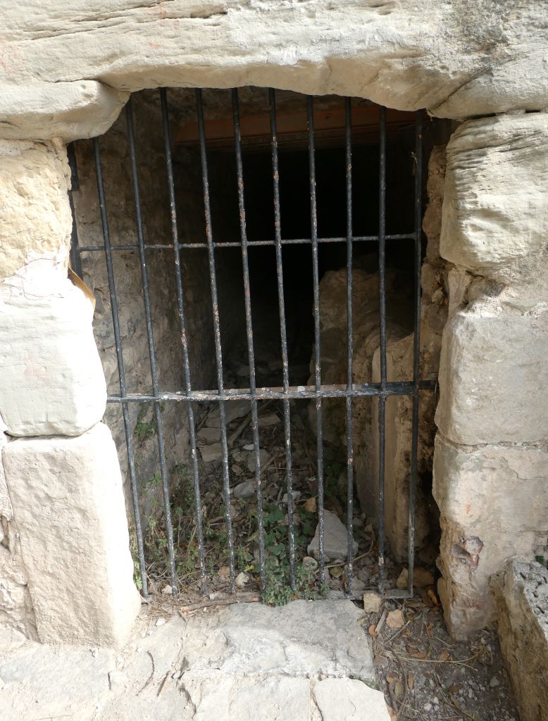 un canal de pedra que circula per l’interior d’una mina a la qual s’hi pot accedir a través d’un barri de ferro.