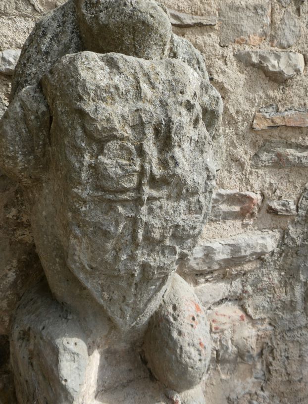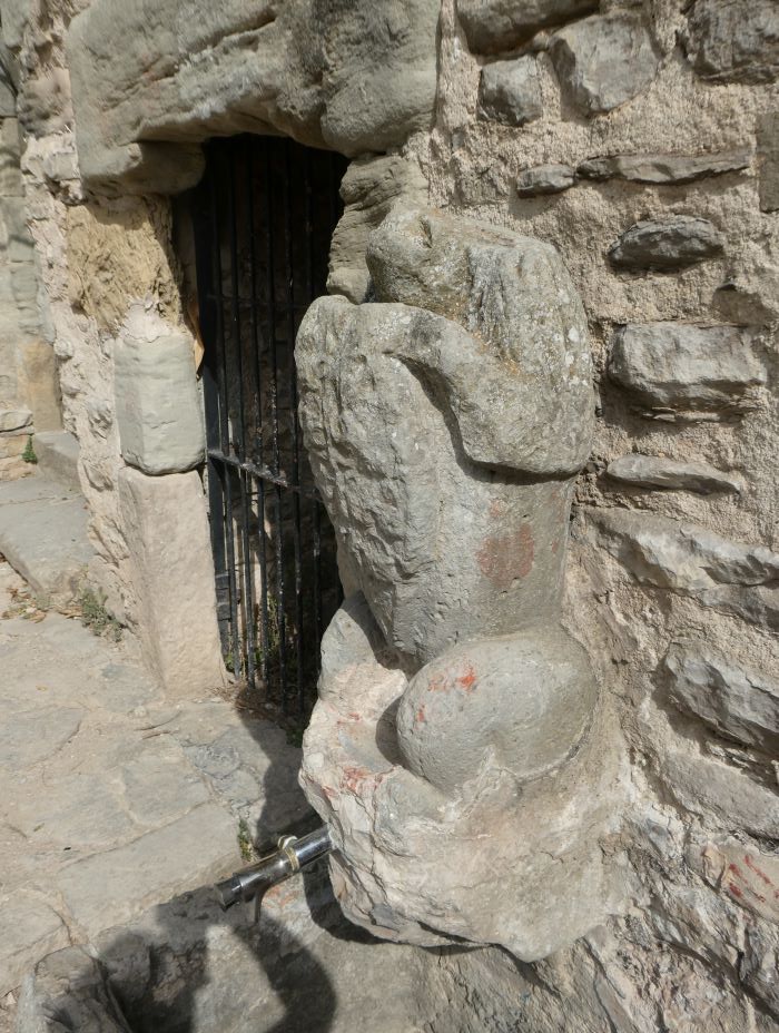 Recorda per la forma un batraci i amb les seves mans i ajudat per les cuixes, aguanta un escut que segons Duocastella (2013) podria tractar-se de l’escut de la baronia de Segur.