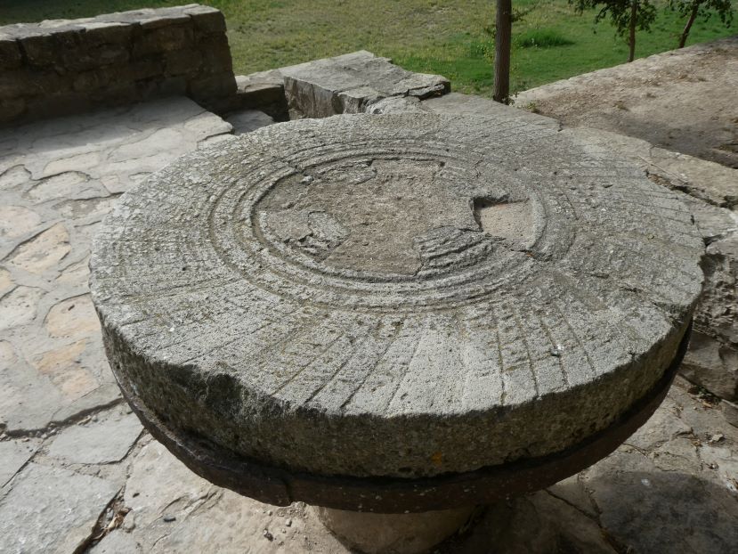 Al davant hi ha una taula de pedra feta amb una roda de molí provinent de l’antic molí de la Roda.